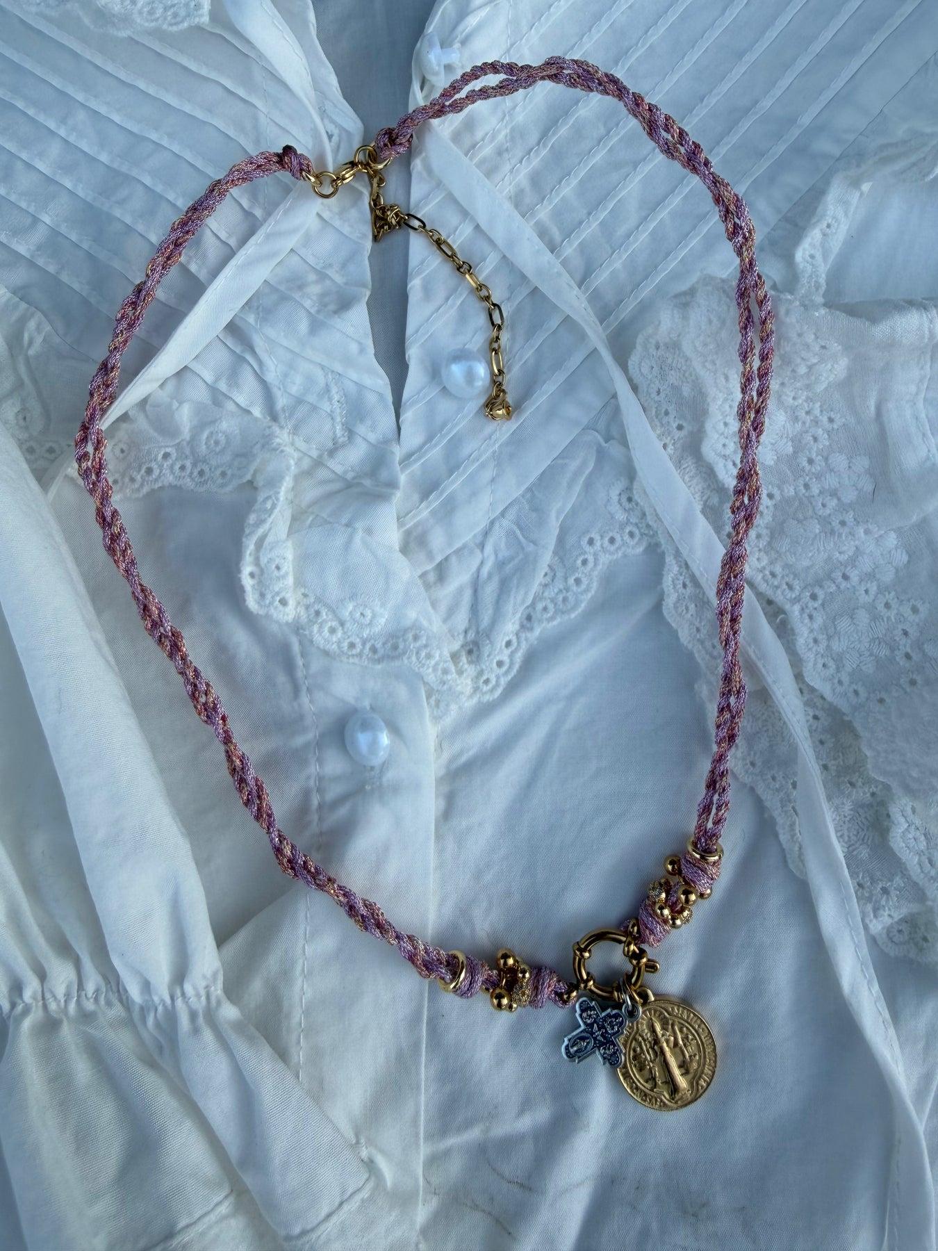 Ce collier réunit deux puissants symboles de protection : la médaille Saint Benoît et la Croix des 4 Saints.