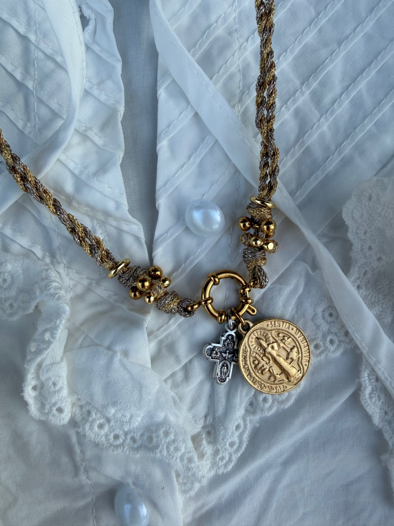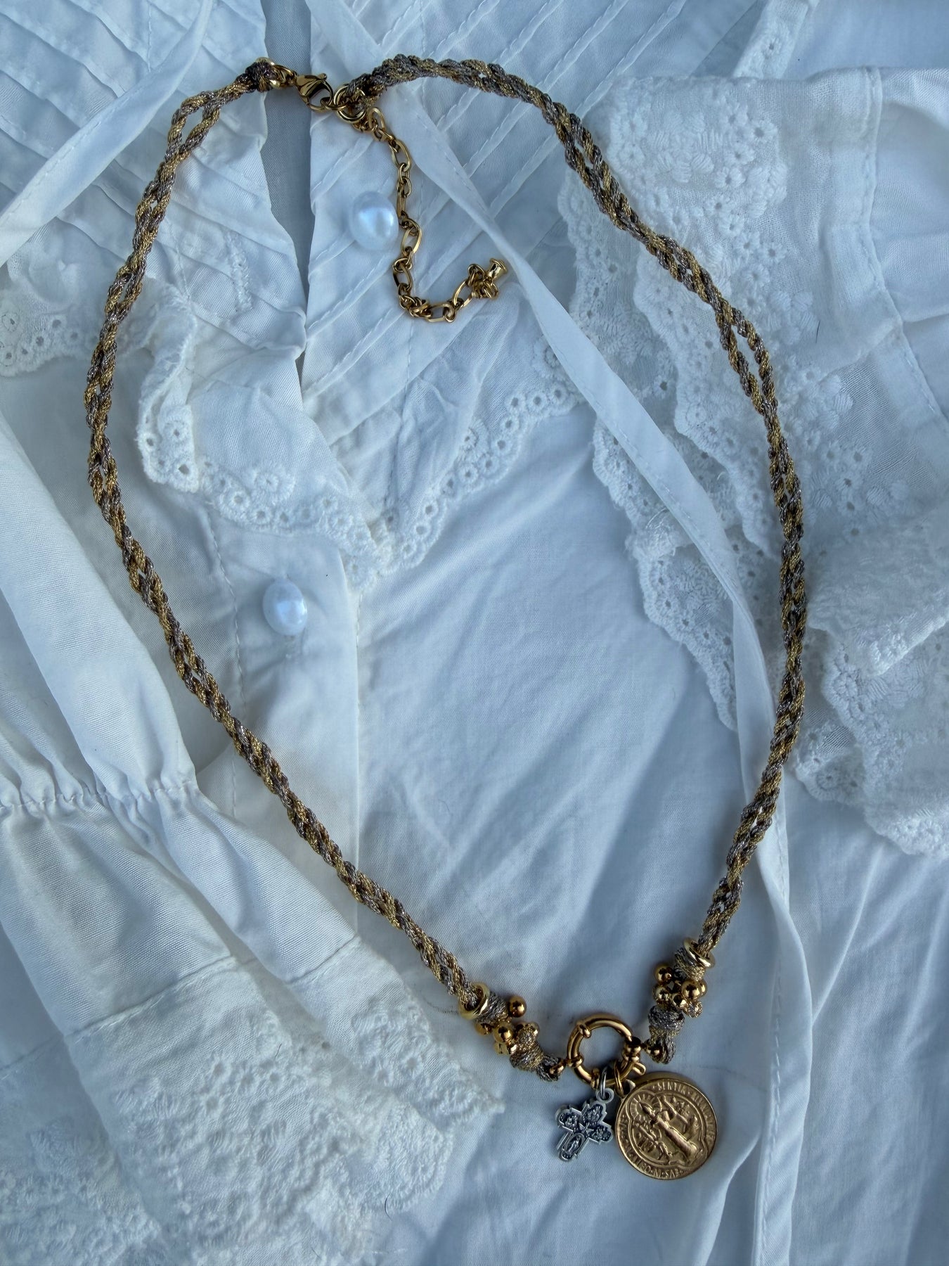 Ce collier réunit deux puissants symboles de protection : la médaille Saint Benoît et la Croix des 4 Saints.