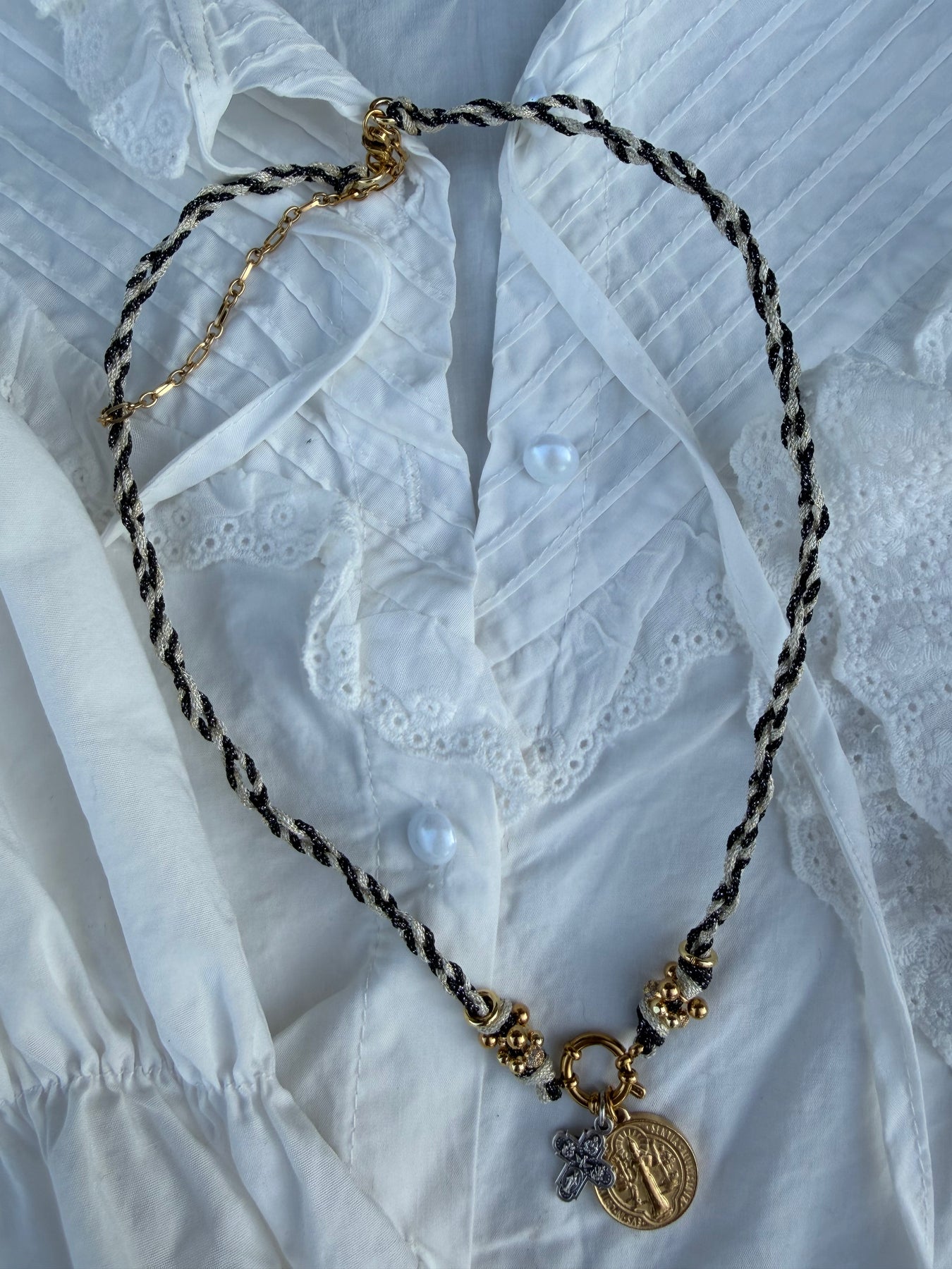 Ce collier réunit deux puissants symboles de protection : la médaille Saint Benoît et la Croix des 4 Saints.