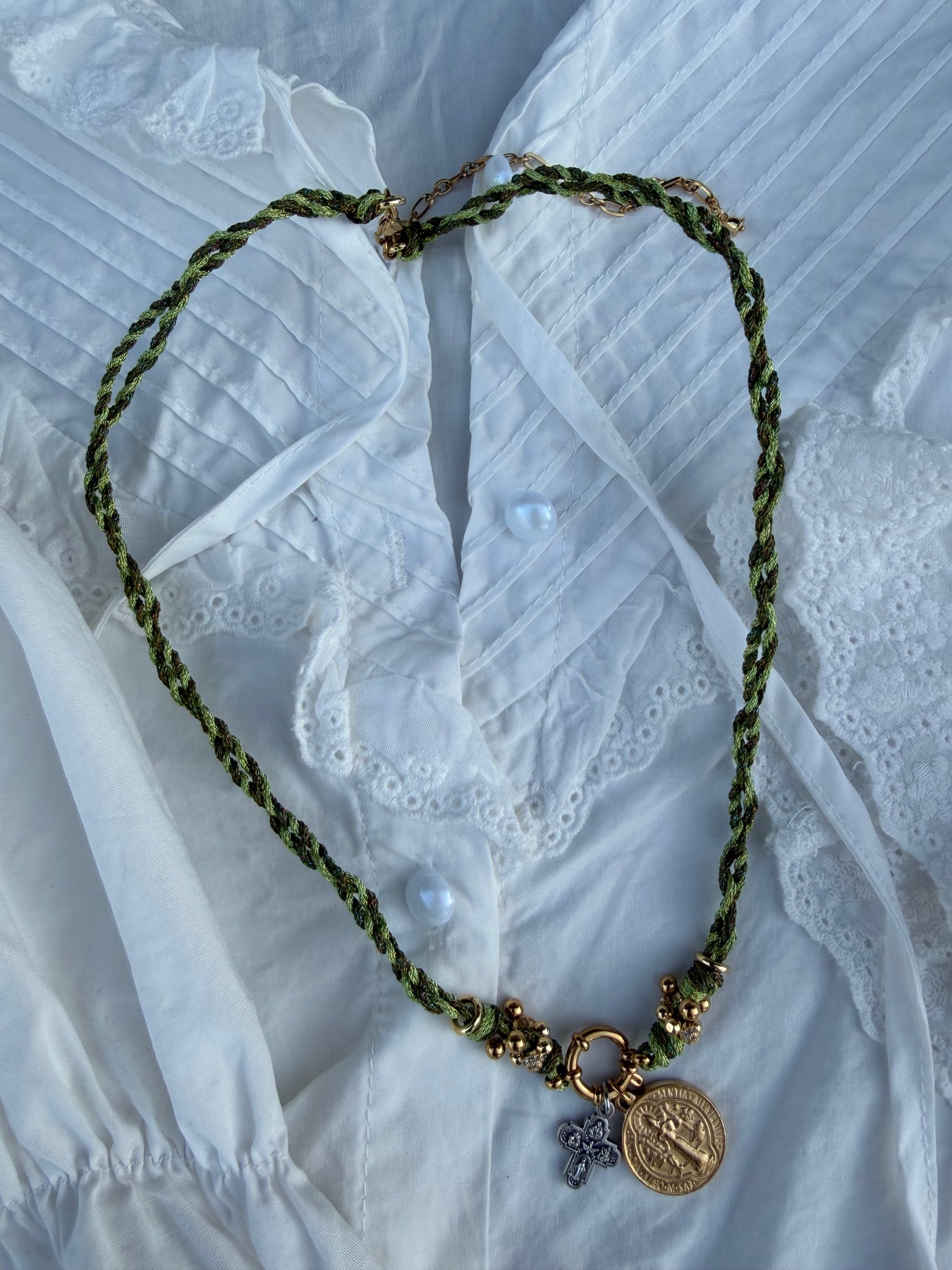 Ce collier réunit deux puissants symboles de protection : la médaille Saint Benoît et la Croix des 4 Saints.